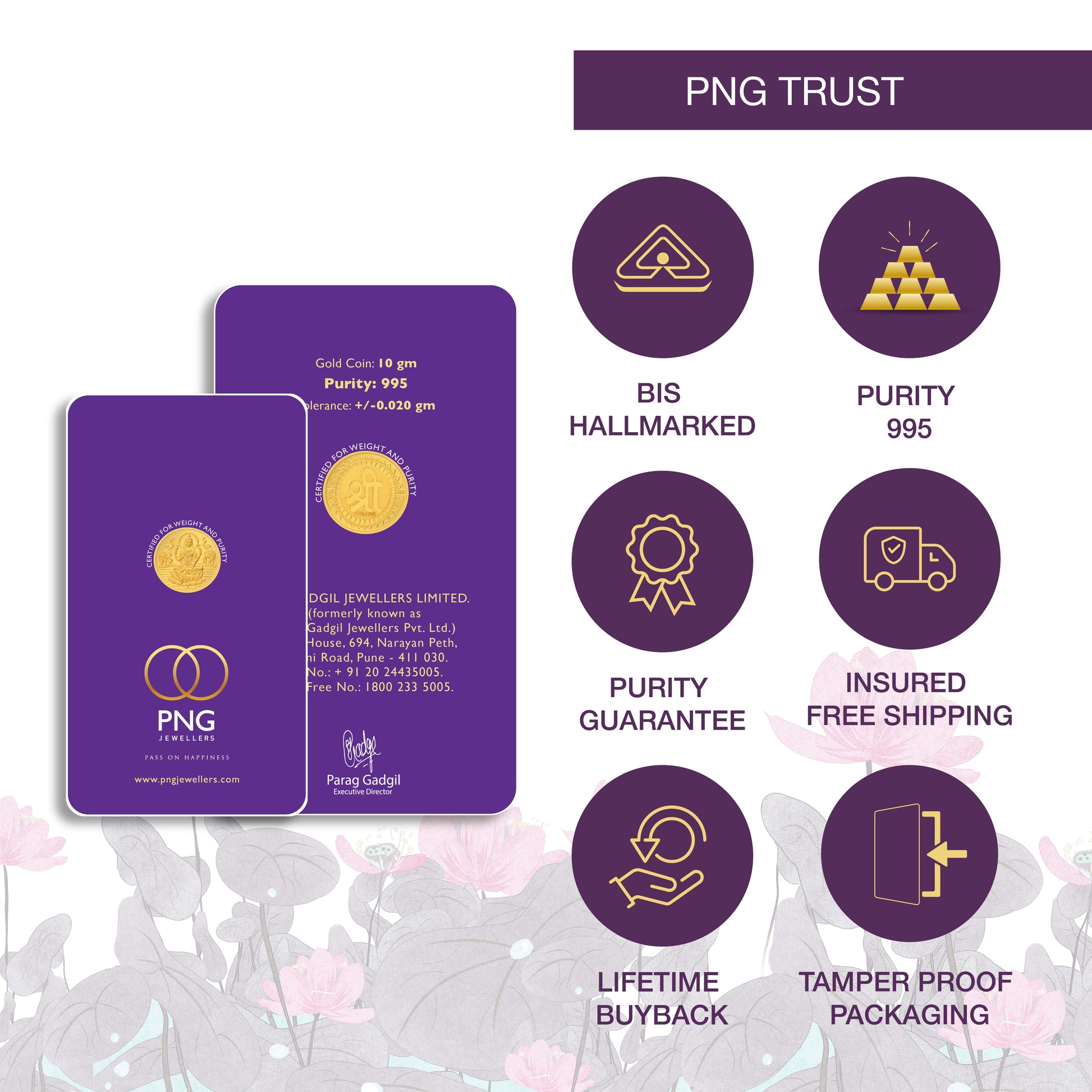 Invest in pure gold with this gleaming gold coin featuring PNG logo. Makes for a great option for gifting too ! This 24K gold coin comes in 995 purity.
