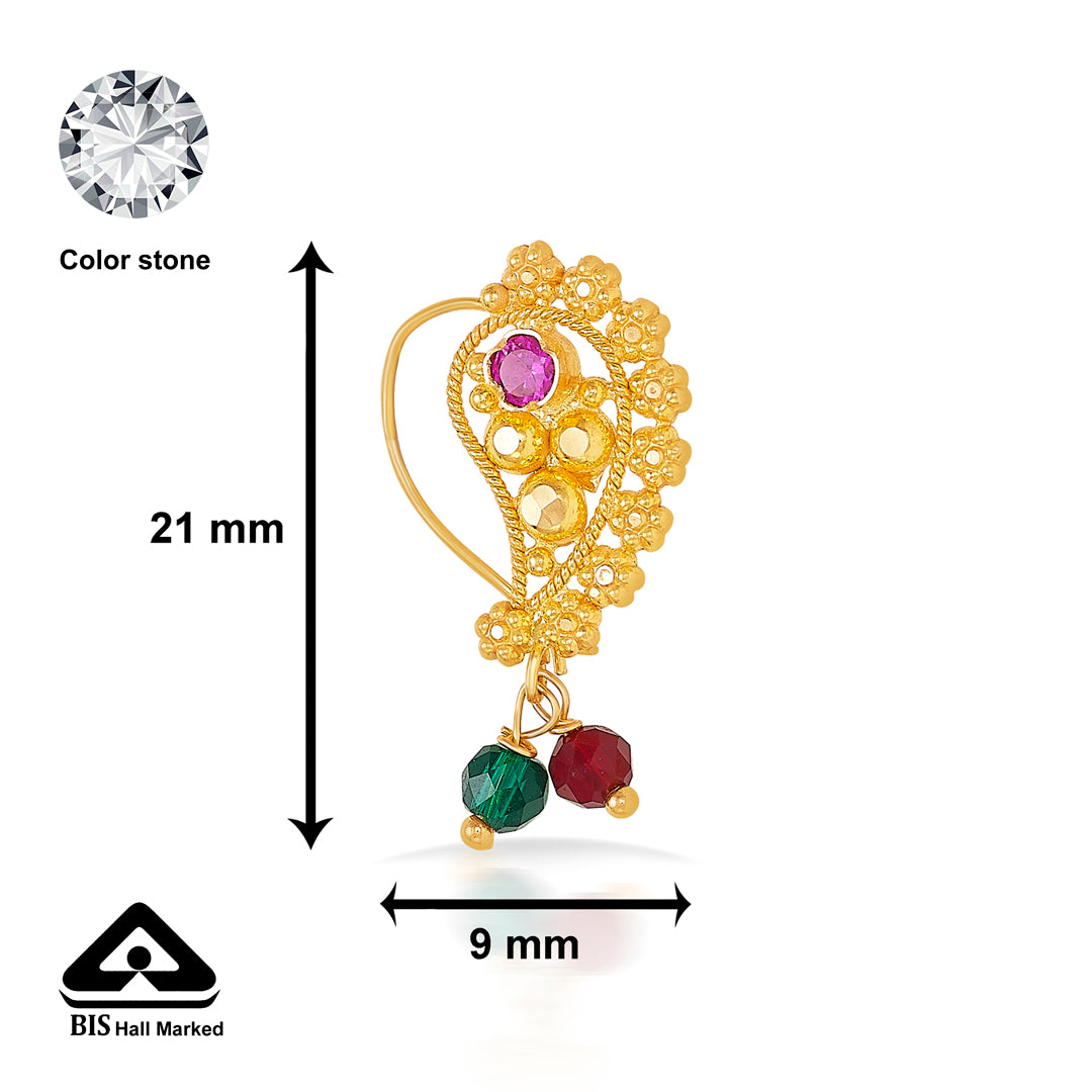 Check out our 22 Karat (916) BIS Hallmarked Yellow Gold Stone Studded Nath. It's ideal for daily wear or as a special gift. Great for birthdays, anniversaries, or Rakshabandhan, this BIS Hallmarked Stone Studded Nath is made to be treasured. It's versatile enough for both festive and casual looks, adding elegance to any outfit. You'll receive it in secure, tamper-proof packaging, ensuring safety and peace of mind. Additionally, it comes with a lifetime warranty and a convenient buyback policy at our stores across India, making it the perfect thoughtful gift.