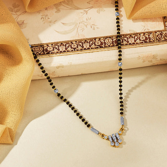 Elevate your elegance with this stunning mangalsutra, crafted for the modern woman who values tradition with a contemporary touch. The shimmering diamonds add a radiant sparkle, perfectly complementing the classic black beads.