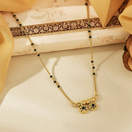 A perfect fusion of tradition and modernity, this mangalsutra reflects eternal love and harmony. The interlinked circles signify unity and completeness, while the classic black beads add cultural depth.