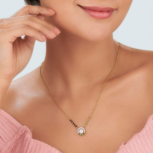 Elevate your elegance with this stunning mangalsutra, crafted for the modern woman who values tradition with a contemporary touch. The shimmering diamonds add a radiant sparkle, perfectly complementing the classic black beads.