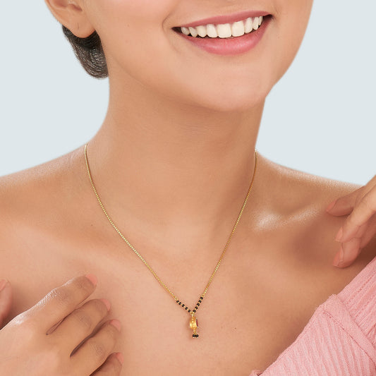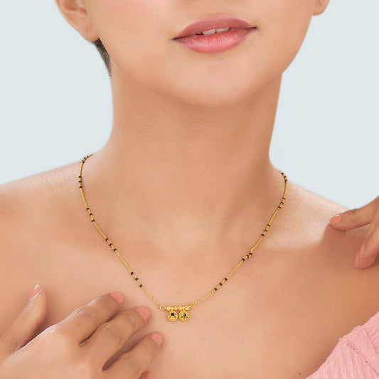 Elevate your elegance with this stunning gold mangalsutra, crafted for the modern woman who values tradition with a contemporary touch. Perfectly complementing the classic black beads.