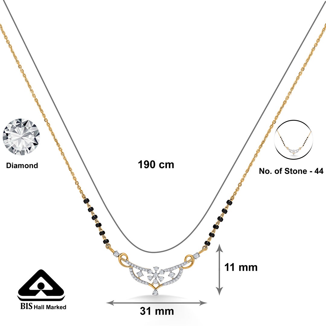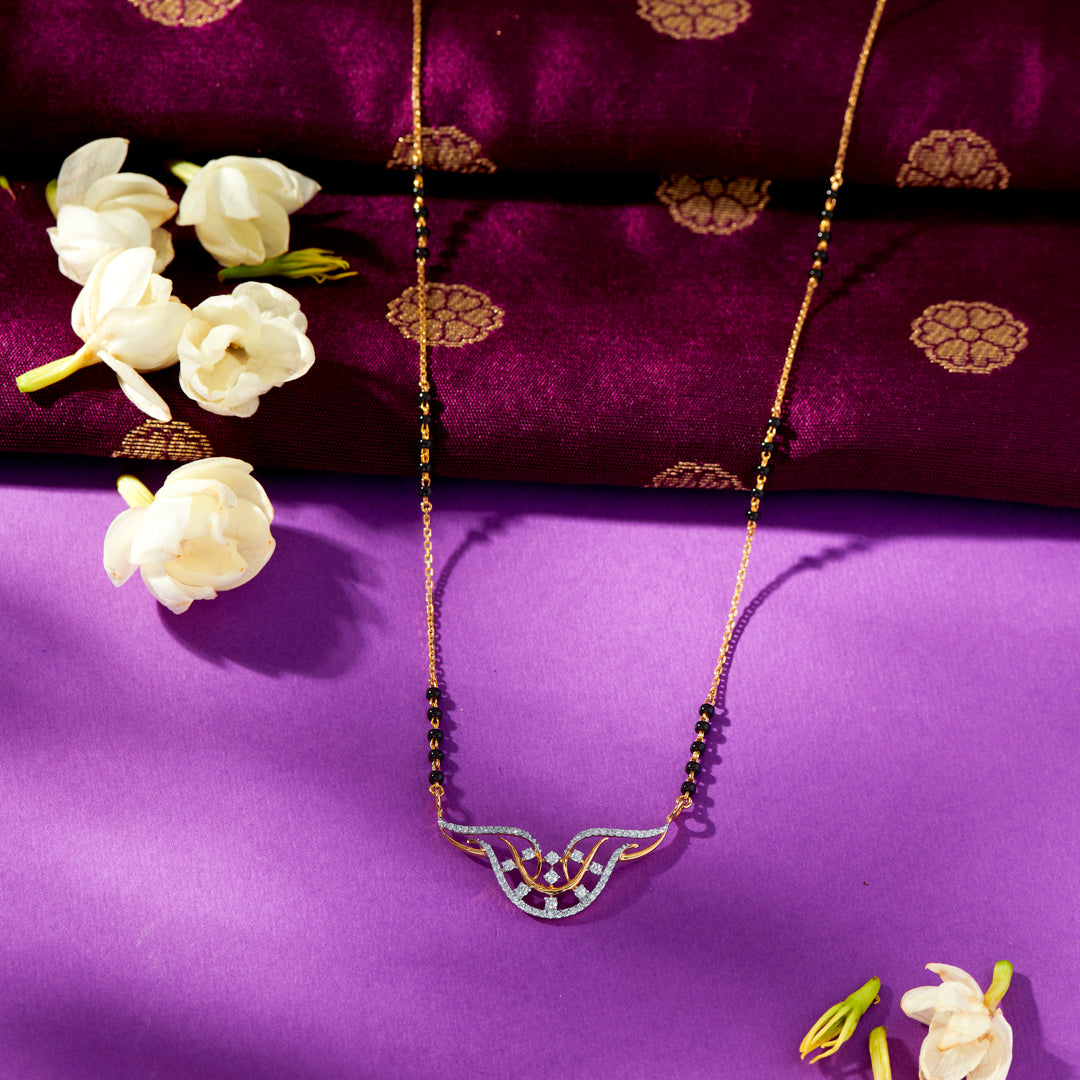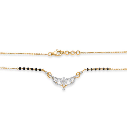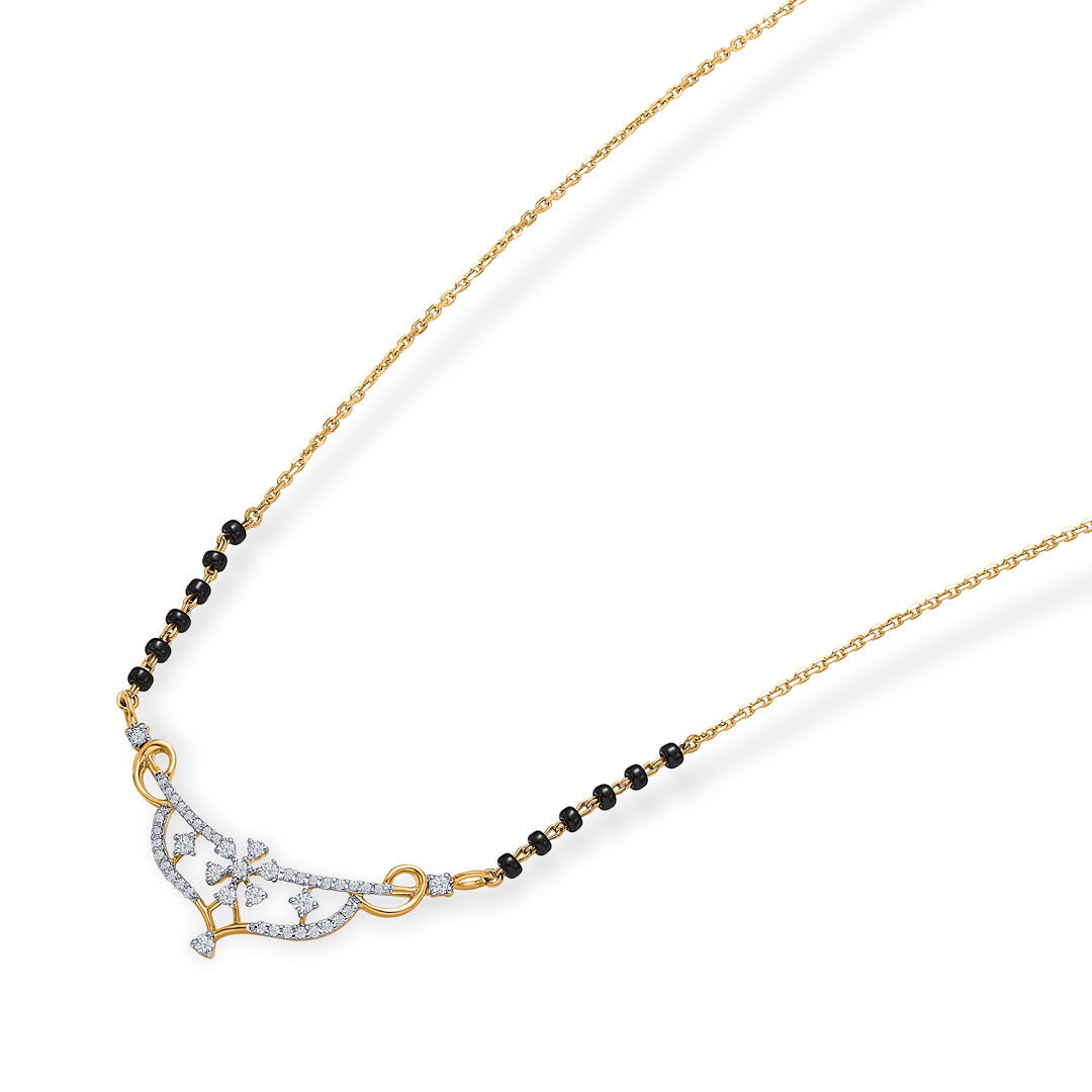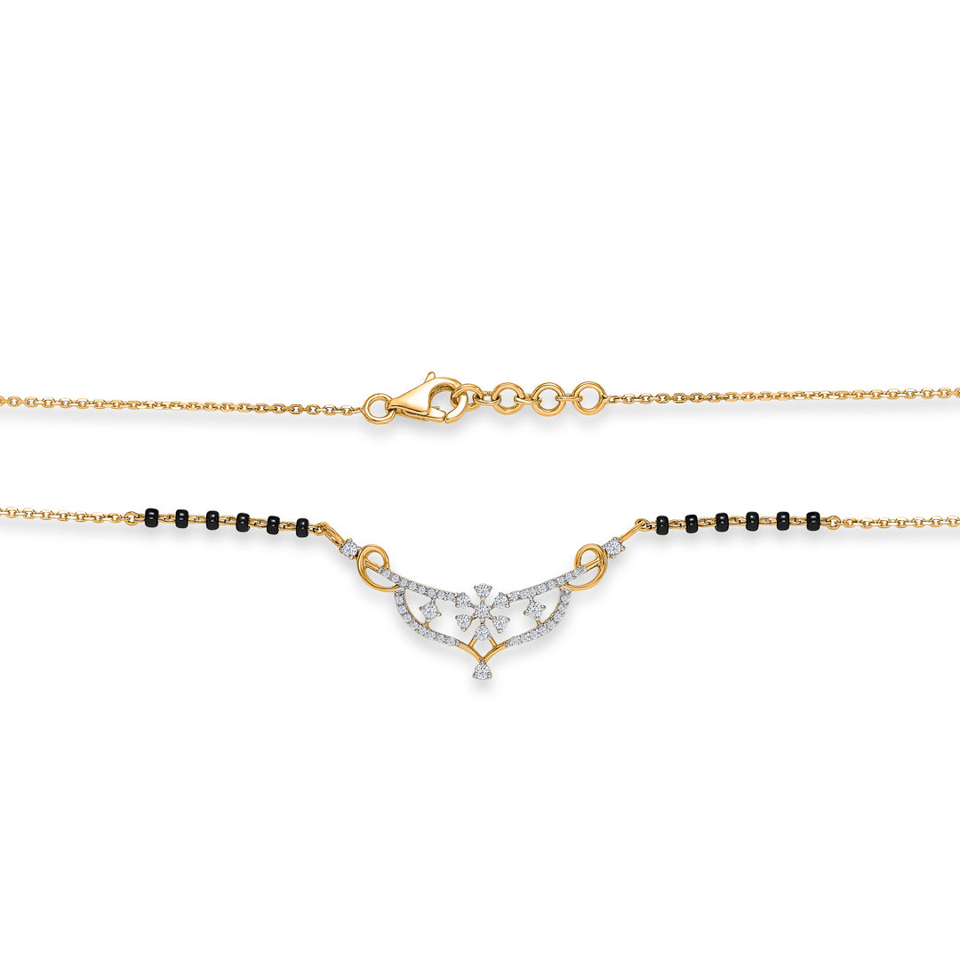 Elevate your elegance with this stunning diamond mangalsutra, crafted for the modern woman who values tradition with a contemporary touch. The shimmering diamonds add a radiant sparkle, perfectly complementing the classic black beads.