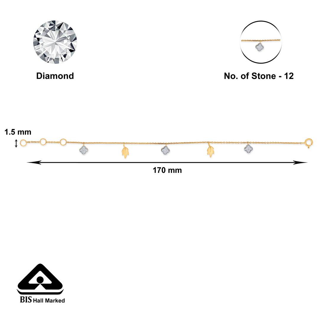 Check out our 14 Karat Gold & Diamond Charm Bracelet, perfect for every woman. With BIS-certified purity and adorned with 15 Pcs of IJ/SI Certified clarity diamonds, it's ideal for daily wear or as a special gift. Great for birthdays, anniversaries, or Rakshabandhan, this ring is made to be treasured. It's versatile enough for both festive and casual looks, adding elegance to any outfit. You'll receive it in secure, tamper-proof packaging, ensuring safety and peace of mind. Additionally, it comes with a lifetime warranty and a convenient buyback policy at our stores across India, making it the perfect thoughtful gift.
