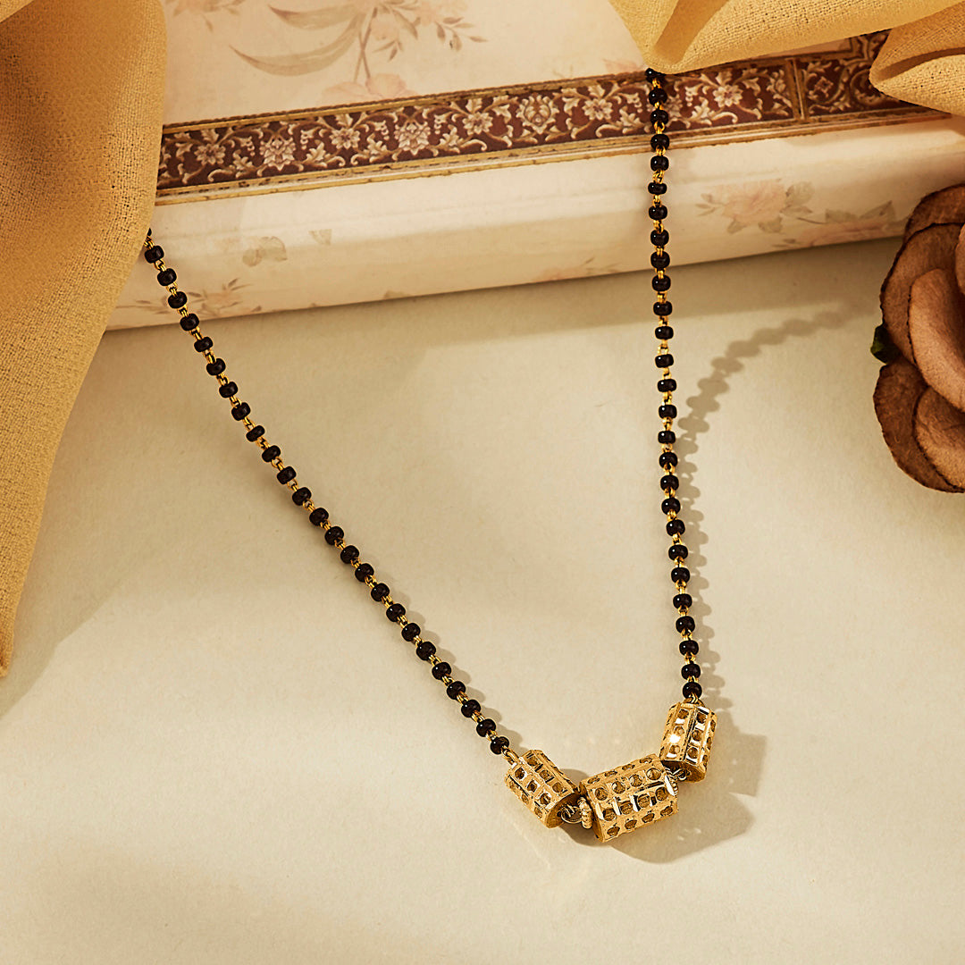 Elevate your elegance with this stunning mangalsutra, crafted for the modern woman who values tradition with a contemporary touch. The shimmering diamonds add a radiant sparkle, perfectly complementing the classic black beads.