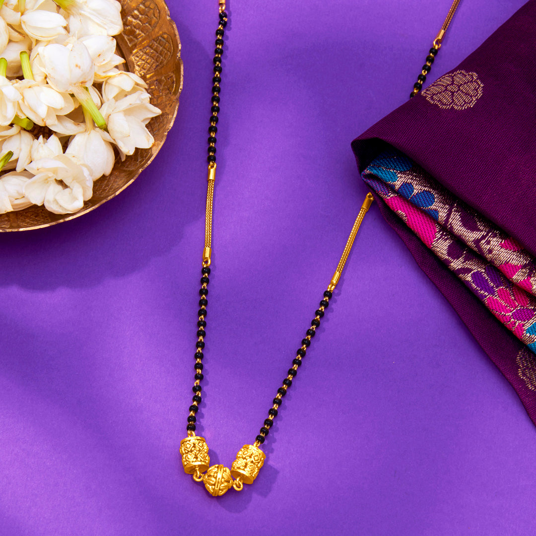This Serene Charm Mangalsutra is made in 22 Karat (916) BSI Hallmarked Purity of Gold. Jewellery comes with inscription of Gold, Purity , Jeweller's Identity Name.This is perfect for casual wear and ideal for festive gifting.
